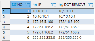 SELECT NO, IP, REGEXP_REPLACE(IP, '\.', '') "DOT REMOVE"