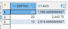 위 내용은 전체의 평균 급여를 구하는 것이 아니라 각 학과별로 평균 급여를 조회하는 것이므로 대상 데이터를 전부 읽은 후 GROUP BY절에 적혀있는 컬럼인 DEPTNO로 분류합니다.