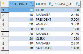 SELECT DEPTNO, JOB, AVG(NVL(SAL, 0)) "AVG_SAL"