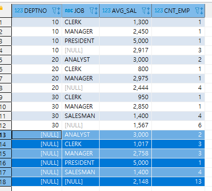 SELECT DEPTNO, JOB, ROUND(NVL(AVG(SAL), 1)) AVG_SAL, COUNT(*) CNT_EMP