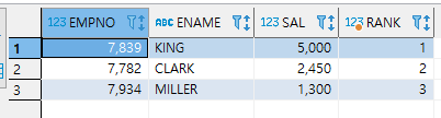 위 예는 ENAME로 ORDER BY한 후 SMITH가 몇번째 나오는지 순위를 구한 것입니다.