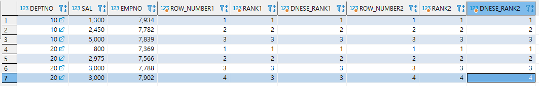 ROW_NUMBER () OVER (PARTITION BY DEPTNO ORDER BY SAL, EMPNO) "ROW_NUMBER2",