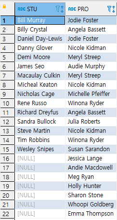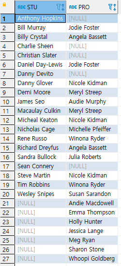 사용 예2. 학생테이블과 교수테이블을 조인하여 학생 이름과 지도교수 이름을 출력하세요. 단 지도학생이 결정되지 않은 교수의 명단도 함께 출력하세요.