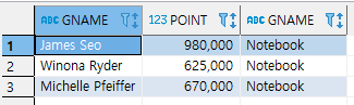 1. customer 테이블과 gift테이블을 join하여 고객이 자기 포인트보다 낮은 포인트의 상품 중 한 가지를 선택할 수 있다고 할 때 notebook을 선택할 수 있는 고객명과 포인트, 상품명을 출력하세요.