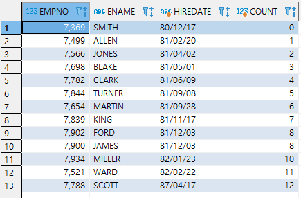 SELECT E1.EMPNO, E1.ENAME, TO_CHAR(E1.HIREDATE, 'YY/MM/DD') AS HIREDATE, COUNT(NVL2(E2.EMPNO, E1.EMPNO, NULL)) COUNT