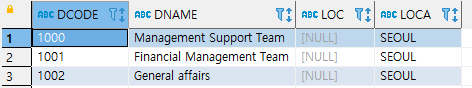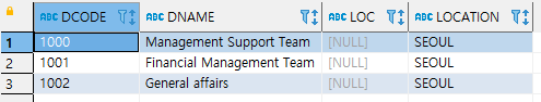LOC컬럼을 확인해 보니 모두 기본값으로 NULL값이 입력되어 있습니다.