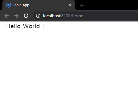 localhost:8100이 실행되며 Hello World ! 가 출력됩니다.