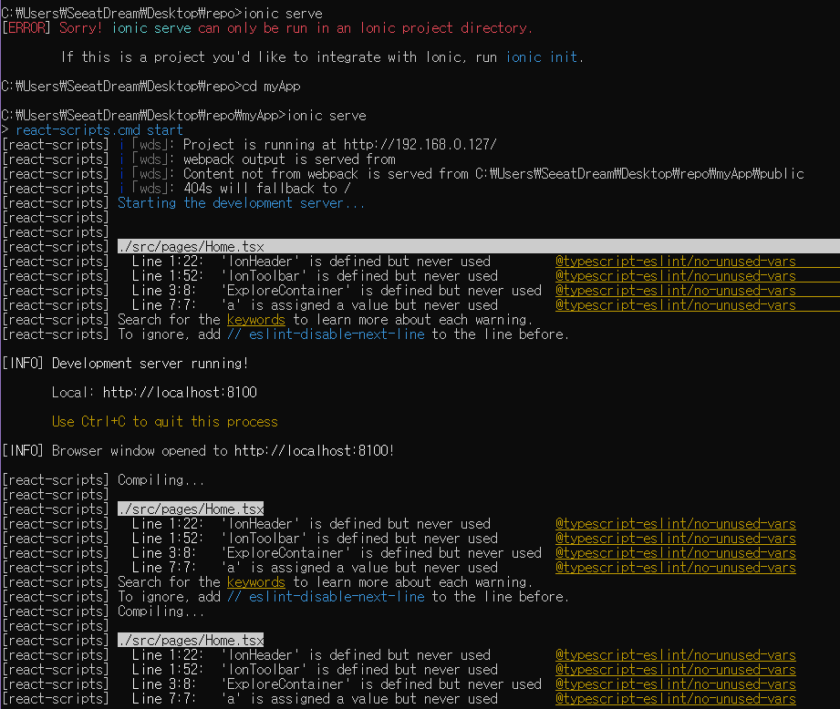 cmd 창으로 돌아가서 ionic serve 명령어를 입력합니다.