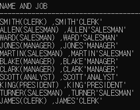 정답 : select ename || '(' || job || ') ,' || ename ||''''|| job ||'''' AS "NAME AND JOB" from emp;