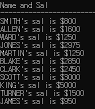 정답 : select ename ||'''s sal is $' || Sal AS "Name and Sal" from emp;