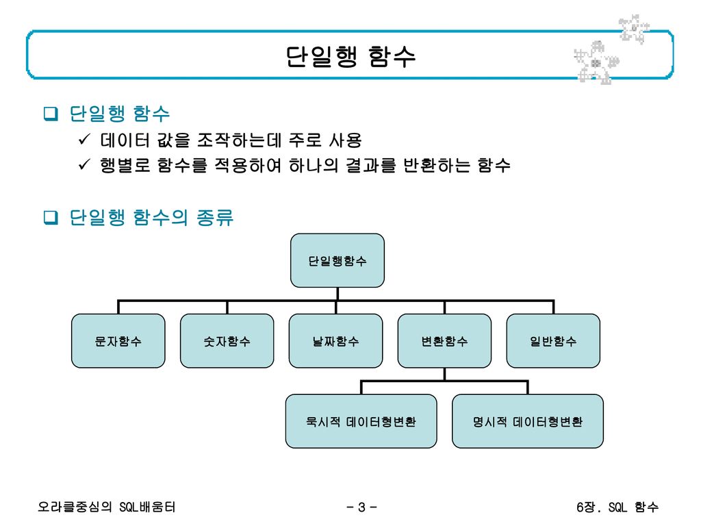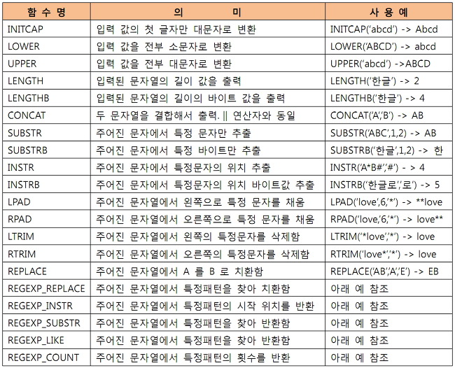 단일행 함수는 입력되는 데이터의 종류에 따라 아래와 같이 구분할 수 있습니다.