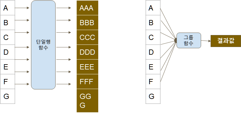 SQL에서는 크게 단일행 함수와 복수행 함수로 구분한다.