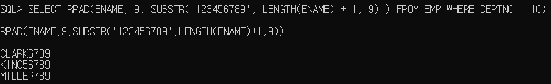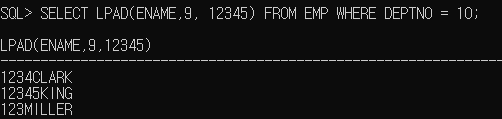 LPAD() : PAD라는 말은 채운다는 뜻. 왼쪽을 채운다는 뜻이고 원래데이터를 오른쪽에 두고 왼쪽에 빈자리가 있을 경우 특정기호나 문자로 채운다.