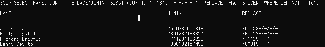 퀴즈 2. STUDENT 테이블에서 아래와 같이 1전공(DEPTNO1)이 101번인 학생들의 이름과 주민등록번호를 출력하되 주민등록 뒤 7자리는 '-' 와 '/'로 표시되게 출력하세요