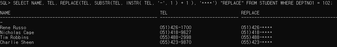퀴즈 3. STUDENT 테이블에서 아래 그림과 같이 1전공이 102번인 학생들의 이름과 전화번호, 전화번에서ㅏ 국번 부분만 '*' 처리하여 출력하세요. 단, 모든 국번은 3자리로 간주합니다.