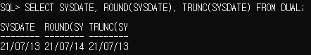 날짜의 ROUND는 하루의 반에 해당하는 시간 즉 낮(정오) 12:00:00 인데, 주어진 날짜가 이 시간을 넘어설 경우에는 다음날짜로 출력하고 이 시간이 안 될 경우에는 당일로 출력합니다.
