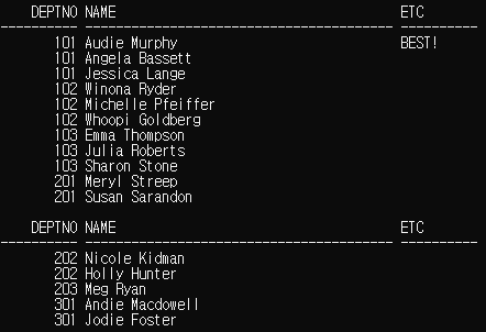 SELECT DEPTNO, NAME, DECODE(DEPTNO, 101, DECODE(NAME, 'Audie Murphy', 'BEST!', NULL)) "ETC" FROM PROFESSOR;
